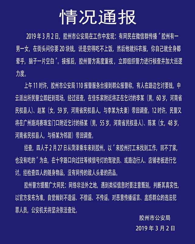 经查,四人于2月27日从菏泽乘车来到胶州,以”来胶州打工未找到工作,回不了家,也没有吃的”为由,在十字路口向过往等候信号灯的驾驶员、或路边行人、店铺老板进行乞讨。经检查四人的随身物品,没有网传的致人头晕的药品。