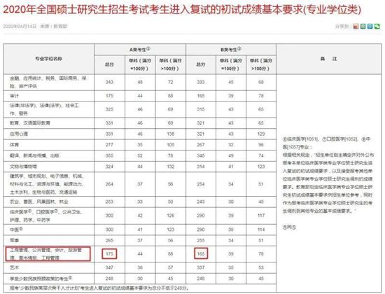 首先,考研国家分数线有学硕和专硕之分,且A类考生和B类考生的分数线不一样,不能一概而论。以传言中“管理类”为例,据教育部公开发布的信息显示,2020年学硕管理学国家线:A类考生345分,B类考生335分;2020年专硕工商管理、公共管理、会计、旅游管理、图书情报、工程管理国家线:A类考生175分,B类考生165分;2019年学硕管理学国家线:A类考生345分,B类考生335分;2019年专硕工商管理、公共管理、会计、旅游管理、图书情报、工程管理国家线:A类考生170分,B类考生160分。可见,从2019年到2020年,只有专硕分别上调了5分,而学硕并没有变化。