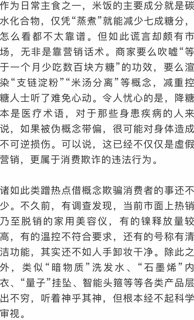 有效降低米饭中70%的糖分,吃上两大碗也无妨……这段时间,脱糖电饭锅成了各大销售平台的网红,不少消费者都掏了腰包。然而,专业实验表明,数位志愿者吃了脱糖电饭锅与普通电饭锅煮的米饭之后,血糖值并没有什么差异。说白了,脱糖电饭锅压根儿就不能脱糖。