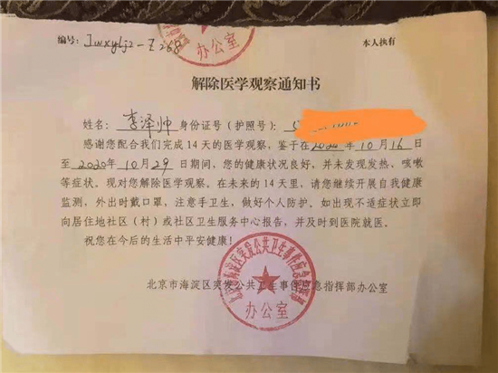据了解,李泽帅21岁,2020年10月16日从加拿大回北京,10月16号至10月29号在北京集中隔离14天后,又在北京待了10天,于11月8日晚上从北京回到泰悦湾小区,均有核酸检测报告及隔离证明。