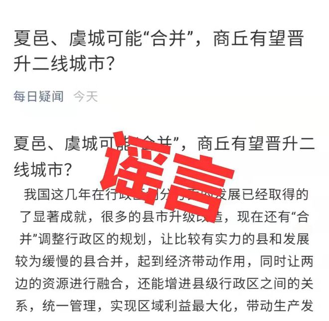 12月13日,河南商丘市委网信办官方微信公众号“网信商丘”发布消息称,近日网上流传一则关于“夏邑、虞城可能‘合并’,商丘有望晋升二线城市?”的消息,据该市民政局所知,该消息为不实消息。