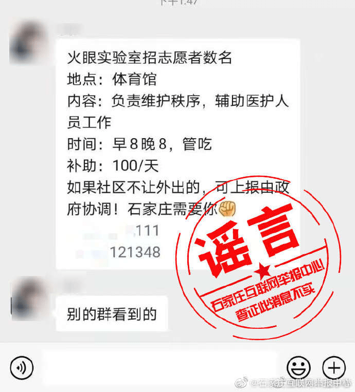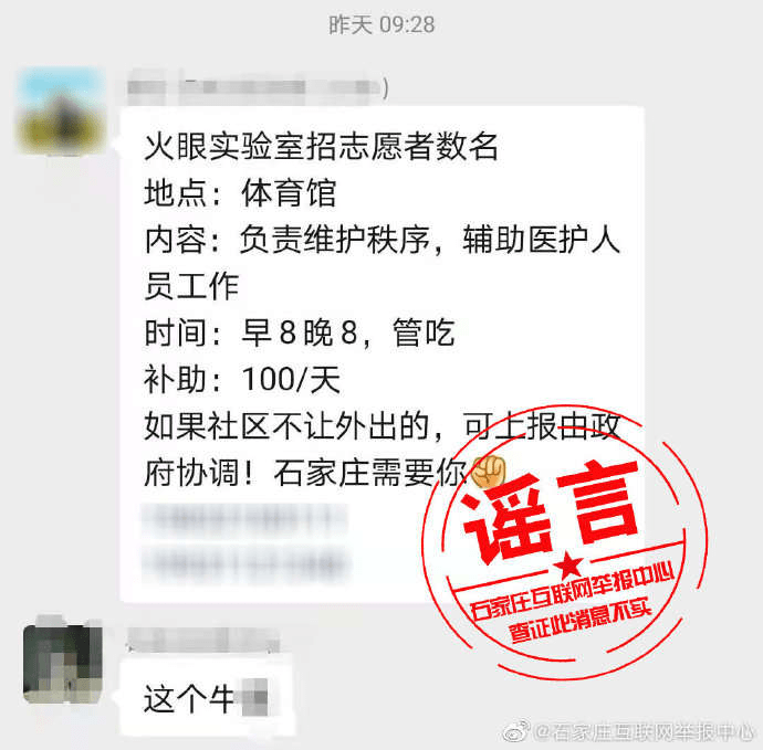 近日,网络流传“河北‘火眼’实验室招聘数名志愿者,负责维护秩序,辅助医护人员工作,管吃还每天补贴100元”的信息。经石家庄互联网举报中心向河北“火眼”实验室相关工作人员核实,该消息为谣言,目前河北“火眼”实验室还没有招聘志愿者计划。