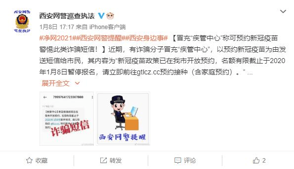 【四川】1月8日,四川公安提醒:近期,多省市已发生冒充疾控中心发布新冠疫苗信息引诱群众点击含木马网址的诈骗,请提高警惕!此为诈骗短信,收到来历不明信息切勿点击!