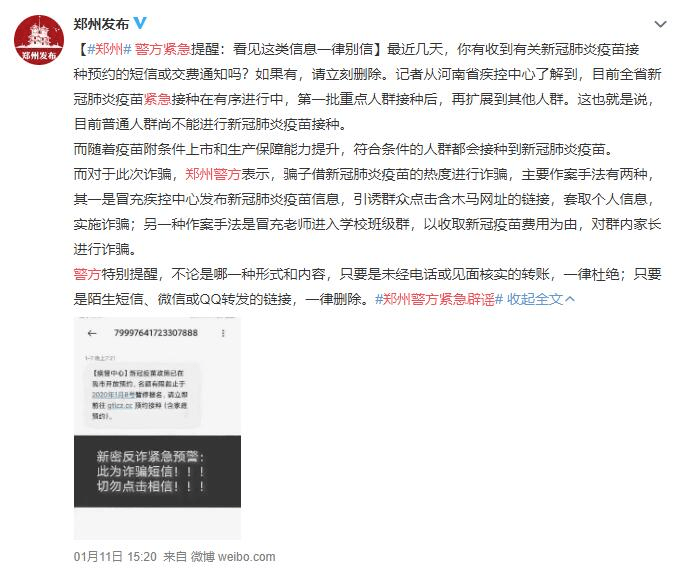 【河南】1月11日,郑州警方特别提醒:骗子借新冠疫苗的热度进行诈骗,主要作案手法有两种,一种是冒充疾控中心发布新冠疫苗信息,引诱群众点击含木马网址的链接,套取个人信息,实施诈骗;另一种作案手法是冒充老师进入学校班级群,以收取新冠疫苗费用为由,对群内家长进行诈骗。