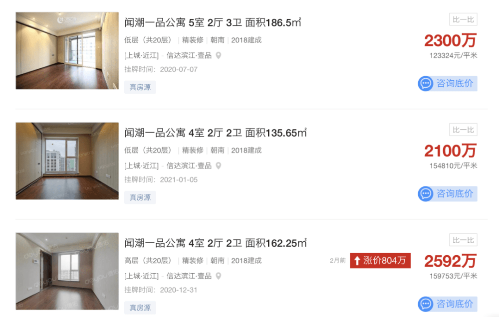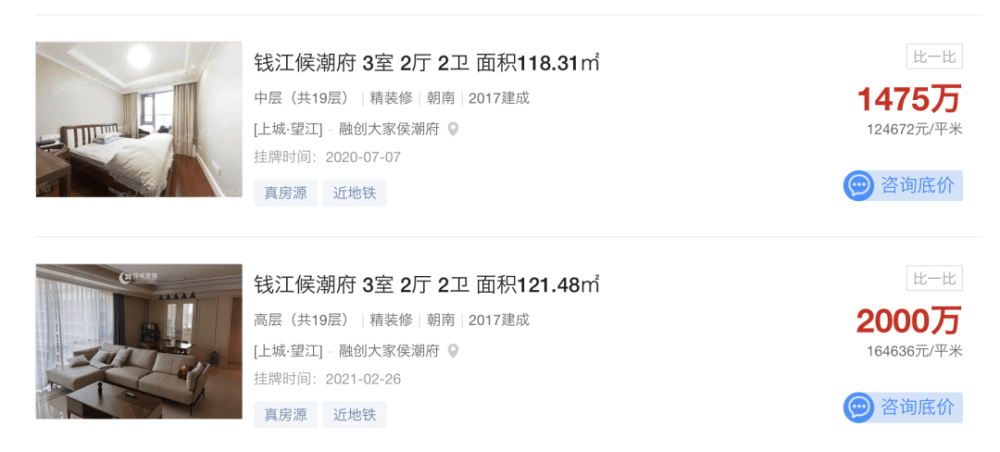 另外,像融创大家侯潮府,在透明售房网好找房平台有11套挂牌房源,其中超过12万元/㎡以上的高价房源也仍然存在。