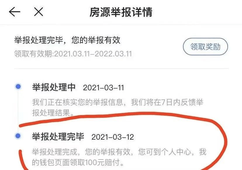 3月12日,贝壳找房APP就审核完毕,显示:“您的举报有效,可至钱包页面领取100元赔付。”