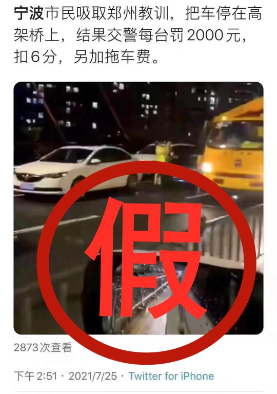 这则谣言在网上流传。 今天有这样一则消息在网上流传:“宁波市民吸取郑州教训,把车停在高架桥上,结果交警每台罚2000元,扣6分,另加拖车费。”