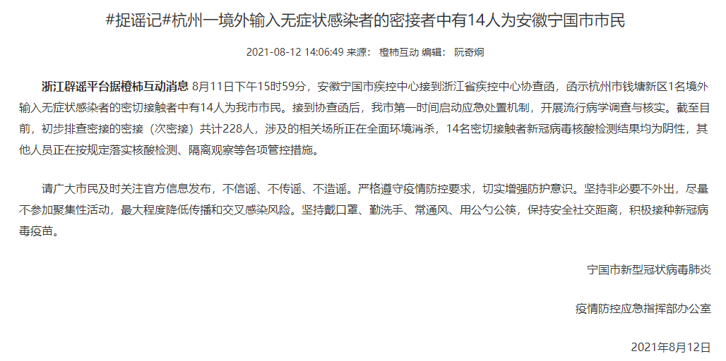 8月11日下午15时59分,安徽宁国市疾控中心接到浙江省疾控中心协查函,函示杭州市钱塘新区1名境外输入无症状感染者的密切接触者中有14人为宁国市市民。
