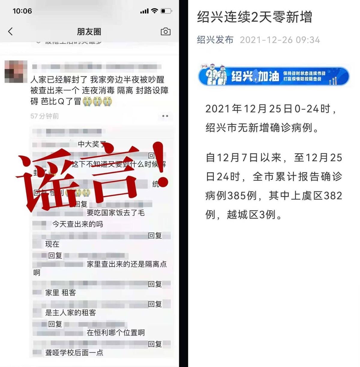 中国蓝新闻客户端讯 25日,有网民在朋友圈传播:“我家旁边半夜被吵醒被查出来一个 连夜消毒 隔离 封路设障碍”并在评论里指出地点在绍兴市上虞区恒利社区。随后该截图被广泛转发。根据权威发布:2021年12月25日0-24时绍兴市无新增确诊病例。此条消息为谣言!
