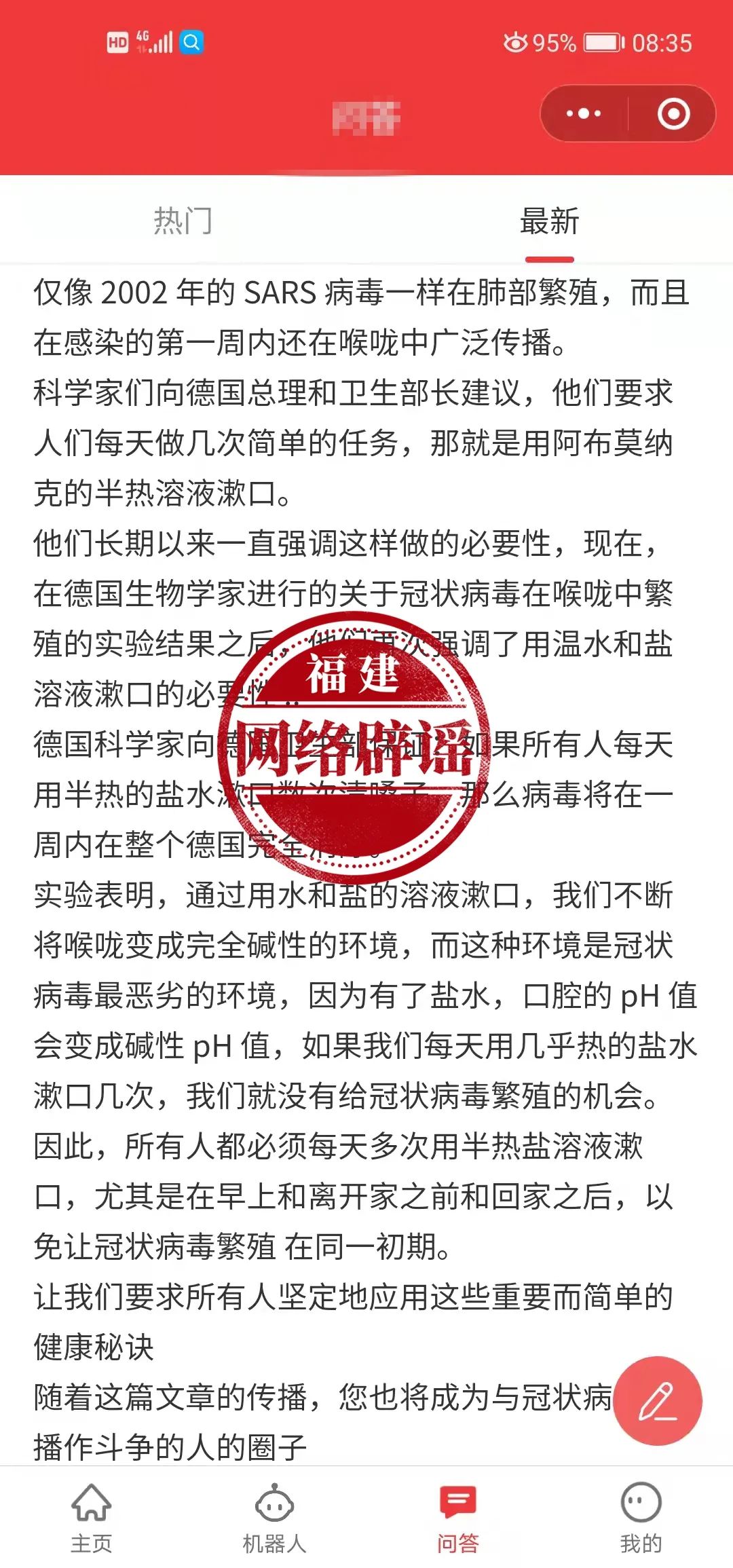 新冠病毒只是一种季节性流感? 世界卫生组织分析新冠肺炎与流感的异同点:新冠肺炎和流感都是呼吸系统疾病,传播方式相似,一些人群新冠肺炎和流感重症的风险较高,同样的保护措施对新冠肺炎患者有效,又对流感有效。但是新冠肺炎和流感治疗方法不一样,新冠疫苗和流感疫苗不一样。 国际知名事实核查机构factcheck指出:虽然某些新冠肺炎症状可能是轻微的,但出现严重后果的可能性远高于普通感冒——尤其是对老年人而言。 半热的盐水漱口可以预防新冠肺炎? 福州市疾控中心传染病防控科副主任医师郑霄雁表示:盐水、醋和温水对新冠病毒没有杀灭作用。 广医一院指出:盐水漱口有利于清洁口腔和咽喉,对于咽喉炎有帮助。但是新型冠状病毒侵犯的部位在呼吸道,漱口没有办法清洁呼吸道。其次,目前尚无任何研究结果提示盐水对新型冠状病毒有杀灭作用。 福建辟谣提醒: 对于网络上的消息,要留个心眼,冷静对待,不可盲目相信。关注官方的消息,对于未经证实的小道消息,不可轻易转发,不信谣,不传谣,共同维护清朗和谐的网络环境。 来源:福建辟谣 作者: 编辑:王健 |