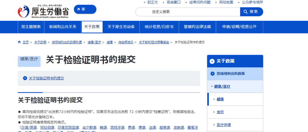网传消息截图 来源:腾讯较真网民提问 事实真是如此吗? 日本取消所有检疫程序、新冠病毒检测? 日本厚生劳动省官方网站明确表示:需向检疫站提交“出发前72小时内的检验证明”。如果您无法在出发前 72 小时内提交“检验证明”,则根据检疫法,您将不被允许登陆日本。 日本厚生劳动省官方网站截图