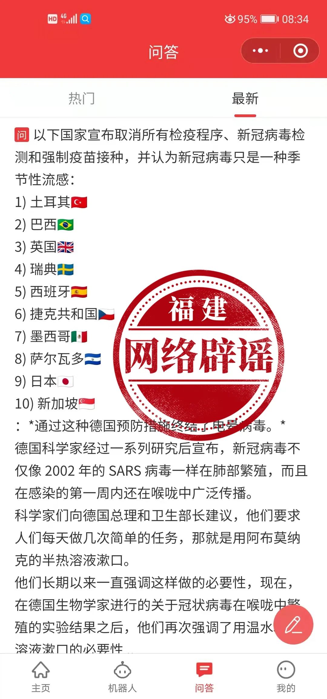 半热的盐水漱口可以预防新冠肺炎?纯属谣言 2022-02-09 11:14 近日,网上热传“日本等国家宣布取消所有检疫程序、新冠病毒检测和强制疫苗接种,并认为新冠病毒只是一种季节性流感。半热的盐水漱口可以预防新冠肺炎”消息,消息内容如下: