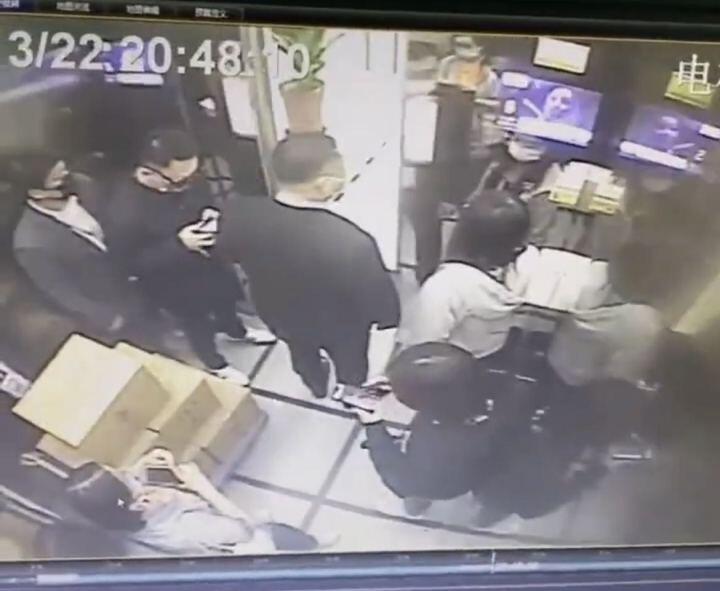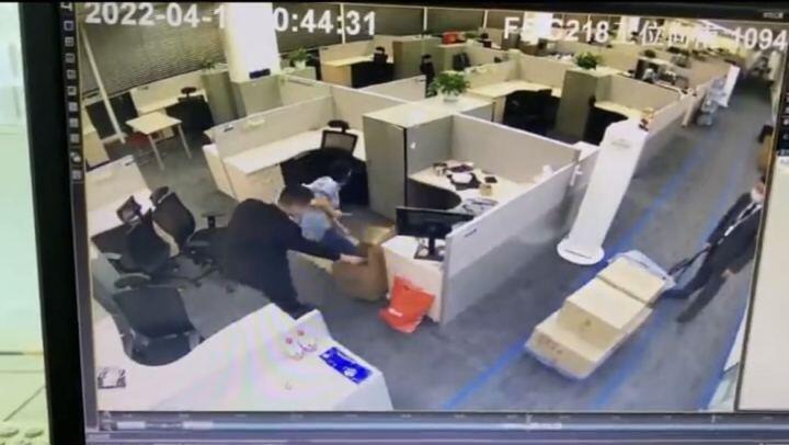 这名保安提供了一份4月13日的监控视频。视频显示,小霞在工位处打包物品时,有三名保安在一旁,其中一名在小霞移动箱子时上前共同拖拽箱子,另外两名保安在工位一旁站立看着。随后的电梯监控视频显示,小霞手持手机先走进电梯,后面跟着一名保安用推车将小霞的5个箱子拉进电梯,紧跟着又上来三名保安。一行五人下电梯后一同走出公司门、再走到办公楼园区门口。