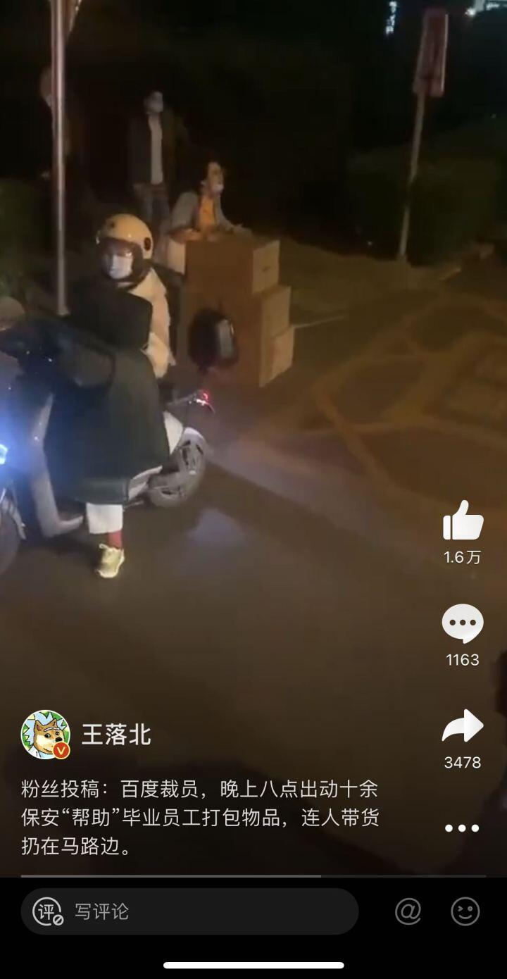 天目新闻消息 4月14日,职场博主@王落北在其微博发布粉丝投稿视频,视频内容为一名女生夜间在马路边大声喊:“万一你哪一天被裁、哪一天被非法解除……”在其身边是五只打包好的纸箱。配文称:百度裁员,晚上八点出动十余名保安“帮助”毕业员工打包物品,连人带货扔在马路边。