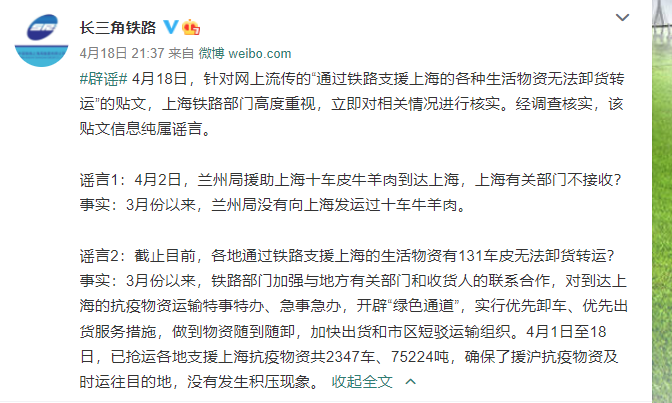 援助上海十车皮牛羊肉无人接收?上海铁路部门辟谣 2022-04-21 14:38 近日,上海辟谣平台收到很多网友询问,关于“兰州局援助上海十车皮牛羊肉无人接收”“各地通过铁路支援上海的生活物资有131车皮无法卸货转运”等消息的真伪。 4月19日,中国铁路上海局集团有限公司通过官方微博辟谣,表示以上信息均为谣言。