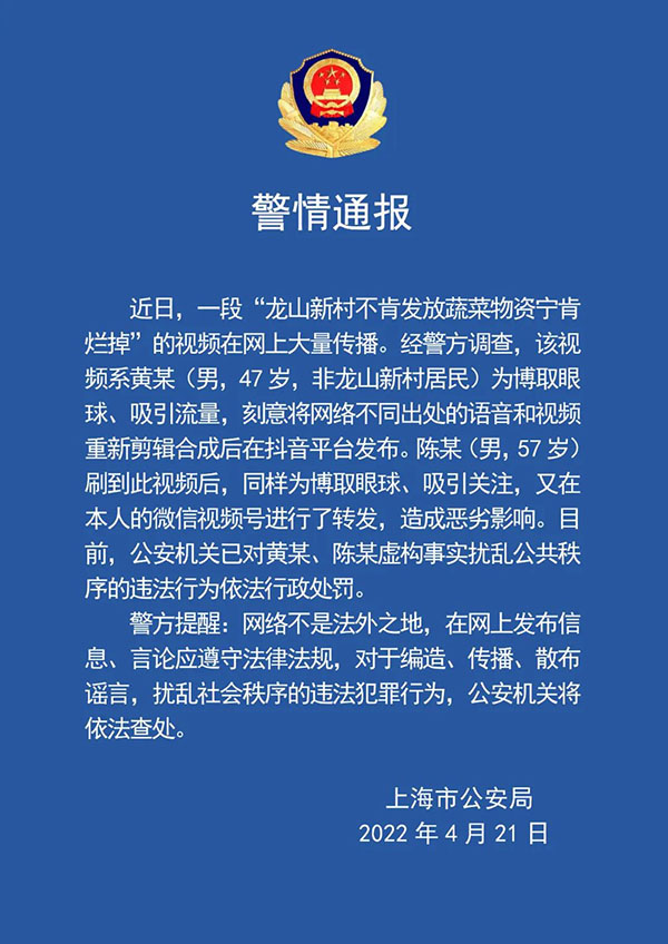 上海龙山新村不肯发放蔬菜物资宁肯烂掉?造谣者已被警方行政处罚