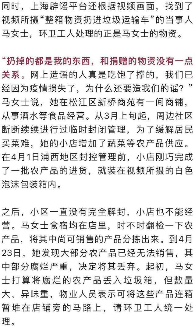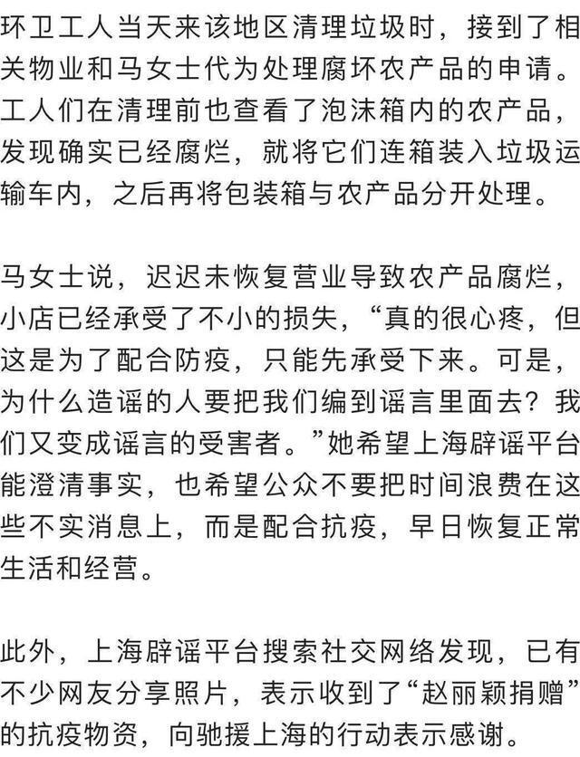 赵丽颖捐赠上海的物资被整箱扔进垃圾车?网友晒收货图辟谣! 2022-04-25 14:18 上海网络辟谣微信公众号消息 近日,有网传聊天记录称,女艺人赵丽颖捐赠上海的抗疫物资被整箱扔进垃圾运输车,并配有“整箱物资扔进垃圾运输车”的视频和贴有“驰援上海抗疫物资赵丽颖捐赠”标签的泡沫包装箱的照片。乍一看,视频里环卫工人丢弃的泡沫包装箱似乎与照片相同:白底红胶带。 但上海辟谣平台求证发现,该聊天记录完全不实。