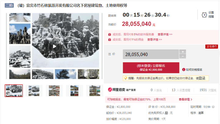 天目新闻消息 4月24日,一则“宜宾市竹石林旅游开发有限公司名下房屋建筑物、土地使用权等”的拍卖信息出现在阿里拍卖平台,预计结束日期为4月25日上午10时。有媒体称,此次拍卖的是被称为世界上最古老的喀斯特地貌(石林)景区——国家“4A”级西部竹石林风景区。