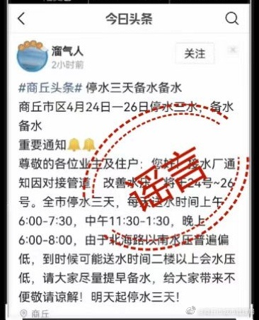 关于网传商丘“停水三天备水备水”通知为不实信息,具体有关停水方面的信息以官方发布为准,请广大市民朋友不信谣、不传谣!