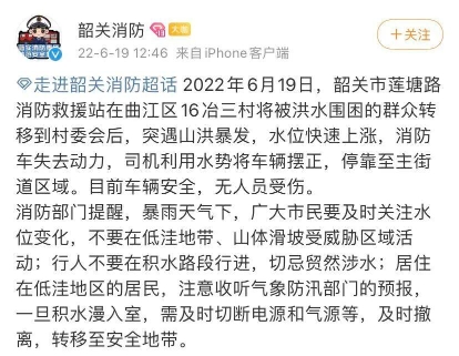 “消防车都冲走了”?广东省韶关市官方回应 2022-06-21 14:54 央视网消息 6月19日,据韶关发布,受强降雨影响,广东省韶关市市区多处出现水浸,暴雨红色预警地区停课。 曲江区马坝镇有商家称,街道很多店铺被淹,有地方水深达一米多,有消防车被洪水冲退。 据韶关消防消息,莲塘路消防救援站在曲江区16冶三村将被洪水围困的群众转移到村委会后,突遇山洪暴发,水位快速上涨,消防车失去动力,司机利用水势将车辆摆正,停靠至主街道区域。目前车辆安全,无人员受伤。