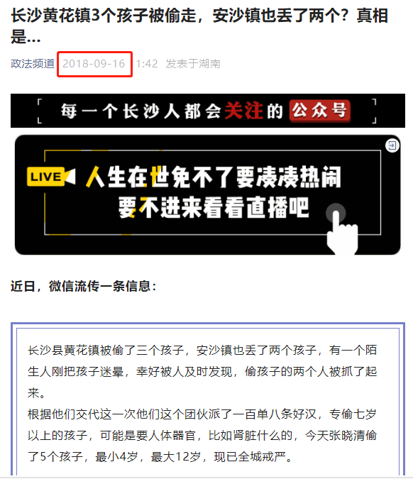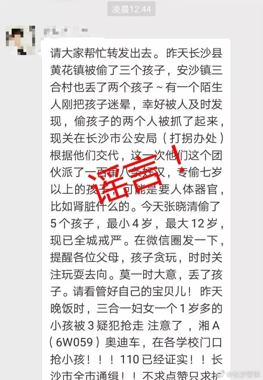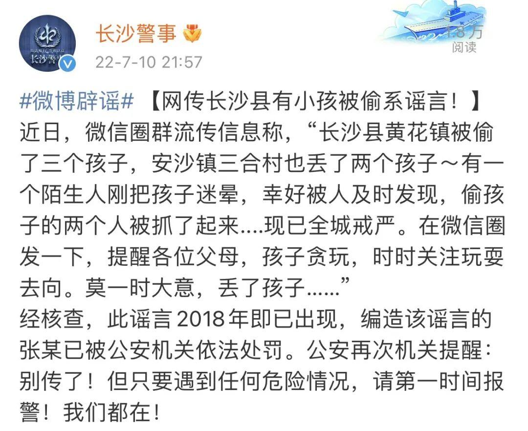 图片来源:“政法频道”微信公众号 7月10日晚 长沙警方回应↓↓ 经核查 此谣言2018年即已出现! 图片来源:长沙警事微博 媒体此前报道 没想到2018年辟谣 还要再发一遍……