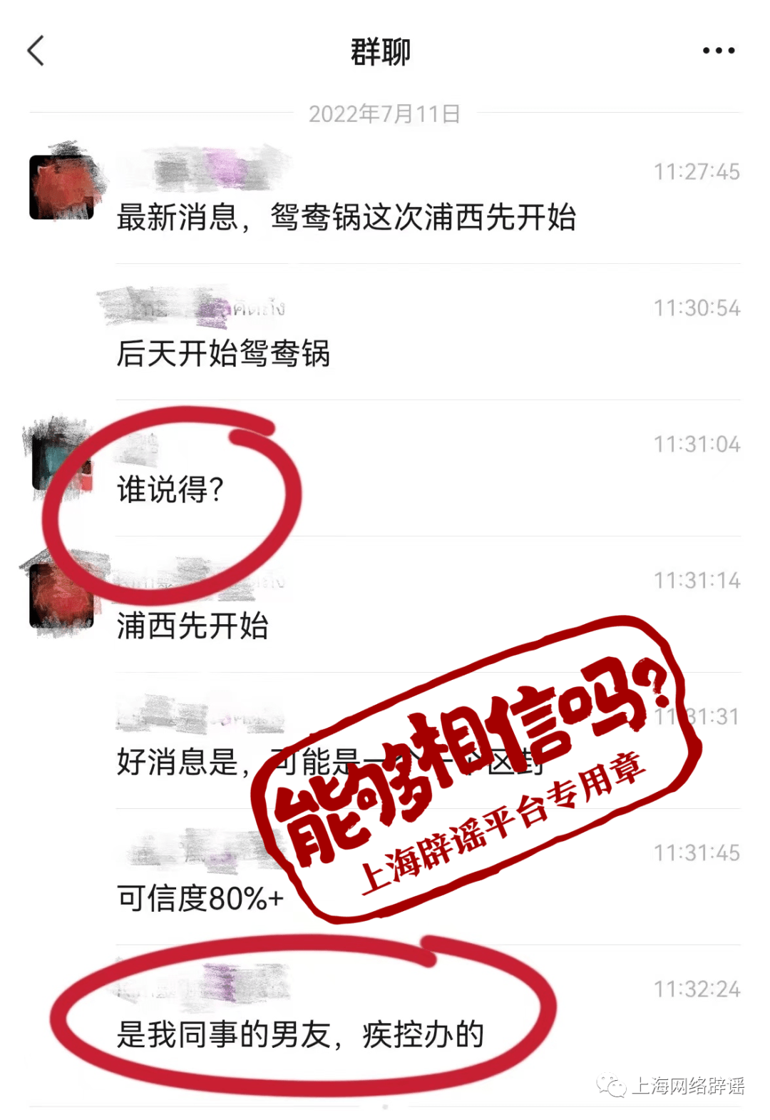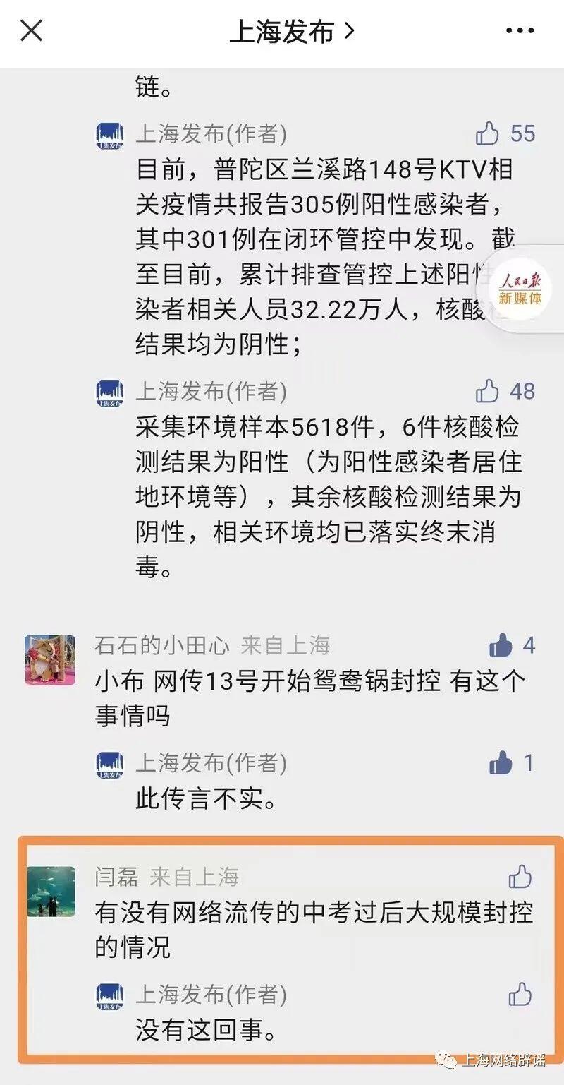 对此,不少网友也给上海辟谣平台留言,提出要呼吁大家提高辨别能力,不轻信出自这类信源的消息;或者在收到这类消息的时候,追问一下,包括传播消息者的准确身份、岗位、具体工作等。网友表示,如果对方无法回答,那么以讹传讹的概率就很大了。 上海辟谣平台在核查时还发现,关于保供信息的聊天记录也不排除部分市民因误解而传播。近期,上海对部分出现病例的社区或场所按照国家和上海市最新版防控方案,实行“足不出户、服务上门”管控措施。在此过程中,由基层管理机构协调保供企业、商超平台等保障居民生活物资需求。由于以上工作涉及保供及相关企业,可能令部分公众产生误解。但是,这是为保障封控地区居民生活的必要举措,不应被夸大传播,制造恐慌。 此外,针对市民关注的“13日开始鸳鸯锅封控”“中考过后大规模封控”等传言,上海发布均已明确答复网友,“此传言不实”“没有这回事”等。