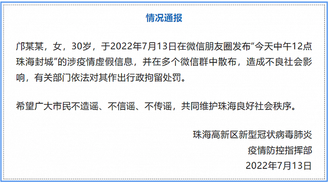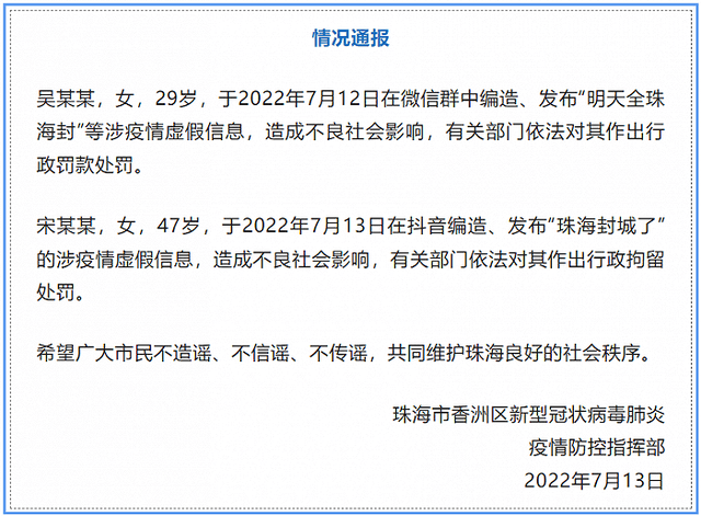 网传“珠海封城”为不实消息 2022-07-14 14:28 通 告 7月11日18时50分左右,我市在中大五院发热门诊发现本轮疫情首例新冠病毒阳性个案。截至目前,所有阳性个案均为海莲幼儿园关联病例,都在同一传播链上,自第4例个案起全部在隔离管控人员或管控区域发现,疫情处置工作正在有序有效进行。 7月13日,网传“珠海封城”为不实消息。请广大市民关注官方权威信息发布,不造谣、不信谣、不传谣,按防疫指挥部通告要求积极参加全员核酸检测,配合做好围合式管理,自觉履行自身防疫责任。相关疫情处置进展会及时通报。对恶意传播不实信息的,将依法追究责任。 感谢广大市民对我市防疫政策的理解、支持和配合。 珠海市新冠肺炎疫情防控 指挥部办公室 2022年7月13日 据香洲区新型冠状病毒肺炎疫情防控指挥部、高新区新型冠状病毒肺炎疫情防控指挥部发布的通告,3名人员因散布“珠海封城”涉疫情虚假信息,分别被处以行政拘留和行政罚款处罚。