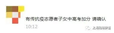 “抗疫志愿者子女中高考加分”?查无此政策 2022-07-14 14:28 近日,有网友给上海辟谣平台留言,希望求证网传“抗疫志愿者子女中高考加分”的真伪。