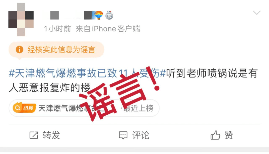 7月19日7时15分许,天津市北辰区天穆镇欢颜里一老旧小区发生燃气爆燃。接举报,有网民在微博发布信息称,该事故起因为“有人恶意报复炸的楼”,此信息为恶劣谣言。