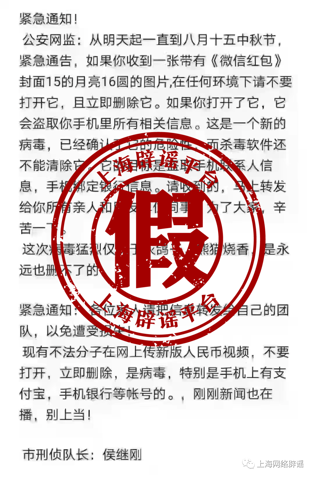从截屏看,本次传播的谣言与6年前传播的主题一致,措辞也基本一致,只有些许字词不同。例如,6年前的谣言是“明天早上06:00晚上24:00紧急通告”变成“从明天起一直到八月十五中秋节紧急通告”;“15的月亮16元”改成“15的月亮16圆”;落款所谓的“刑侦队长:郭于浩”改为“市刑侦队长:侯继刚”等。以上变化并没有改变该传言语句不通、用词不规范的特点,更无法更改这是一条谣言的本质——早在6年前,微信官方就曾发布声明,指出微信红包图片有病毒纯属造谣。