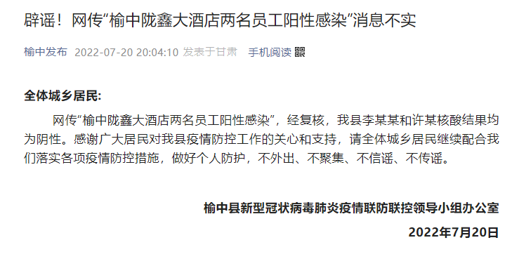“榆中发布”微信公众号7月20日消息,甘肃省兰州市榆中县新型冠状病毒肺炎疫情联防联控领导小组办公室表示,网传“榆中陇鑫大酒店两名员工阳性感染”,经复核,榆中县李某某和许某核酸结果均为阴性。