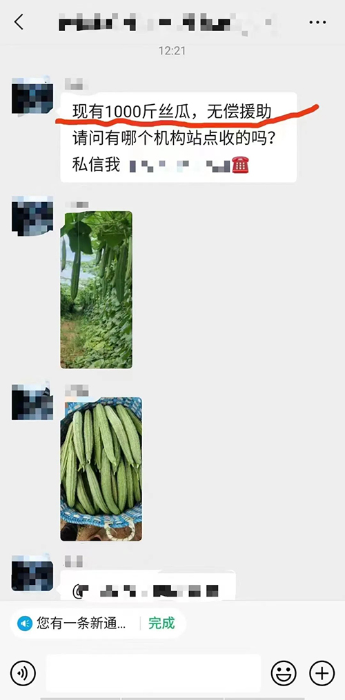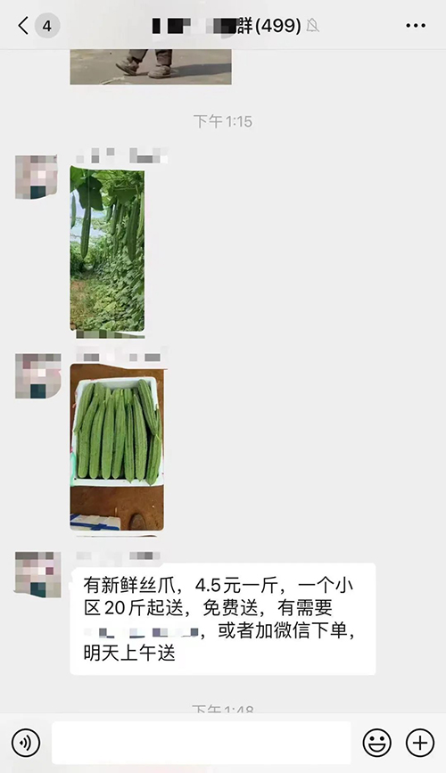 有网友称,其所在微信群里售卖的丝瓜与热心人士捐赠的丝瓜图片一致,疑似将热心人士捐赠的丝瓜拿来售卖↓