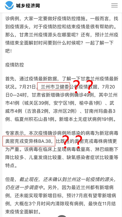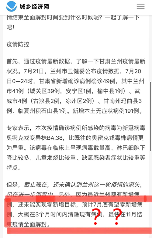 7月22日下午,一则由“城乡经济网”发布的“当前最新消息 甘肃兰州疫情源头在哪里 预计兰州疫情结束全面解封时间”的消息刷爆了小编的朋友圈,许多亲友纷纷私信发来该文截图,并红笔圈出文末重点“大概在3个月时间内清除现有病例,最快在11月结束疫情全面解封”,并附“吓人!真的??”字眼。