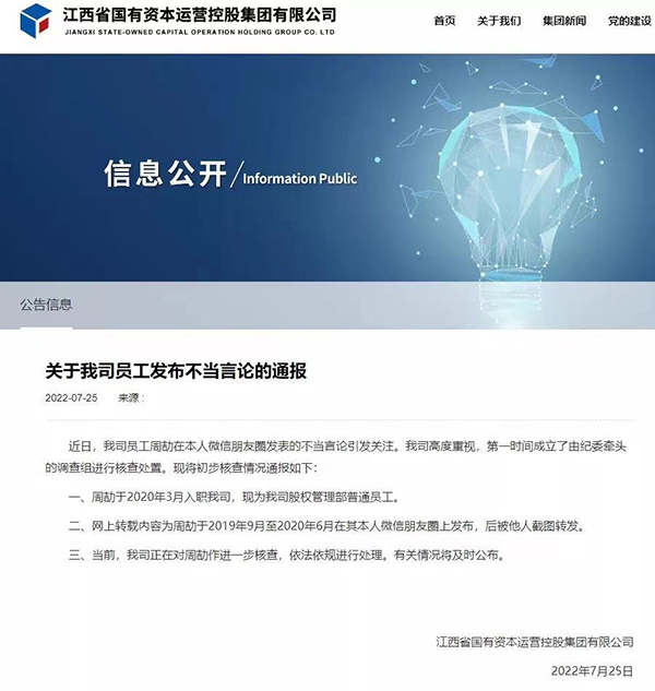 25日,江西省国有资本运营控股集团有限公司通报称,公司第一时间成立了由纪委牵头的调查组进行核查处置。初步核查情况: