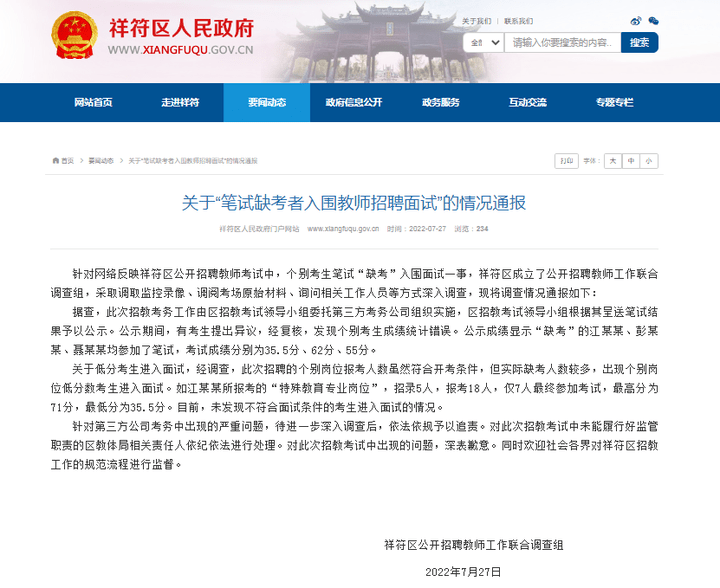 关于“笔试缺考者入围教师招聘面试”的情况通报 针对网络反映祥符区公开招聘教师考试中,个别考生笔试“缺考”入围面试一事,祥符区成立了公开招聘教师工作联合调查组,采取调取监控录像、调阅考场原始材料、询问相关工作人员等方式深入调查,现将调查情况通报如下: 据查,此次招教考务工作由区招教考试领导小组委托第三方考务公司组织实施,区招教考试领导小组根据其呈送笔试结果予以公示。公示期间,有考生提出异议,经复核,发现个别考生成绩统计错误。公示成绩显示“缺考”的江某某、彭某某、聂某某均参加了笔试,考试成绩分别为35.5分、62分、55分。 关于低分考生进入面试,经调查,此次招聘的个别岗位报考人数虽然符合开考条件,但实际缺考人数较多,出现个别岗位低分数考生进入面试。如江某某所报考的“特殊教育专业岗位”,招录5人,报考18人,仅7人最终参加考试,最高分为71分,最低分为35.5分。目前,未发现不符合面试条件的考生进入面试的情况。 针对第三方公司考务中出现的严重问题,待进一步深入调查后,依法依规予以追责。对此次招教考试中未能履行好监管职责的区教体局相关责任人依纪依法进行处理。对此次招教考试中出现的问题,深表歉意。同时欢迎社会各界对祥符区招教工作的规范流程进行监督。 祥符区公开招聘教师工作联合调查组 2022年7月27日 来源:祥符区人民政府门户网站 作者: 编辑:陈俊男 |