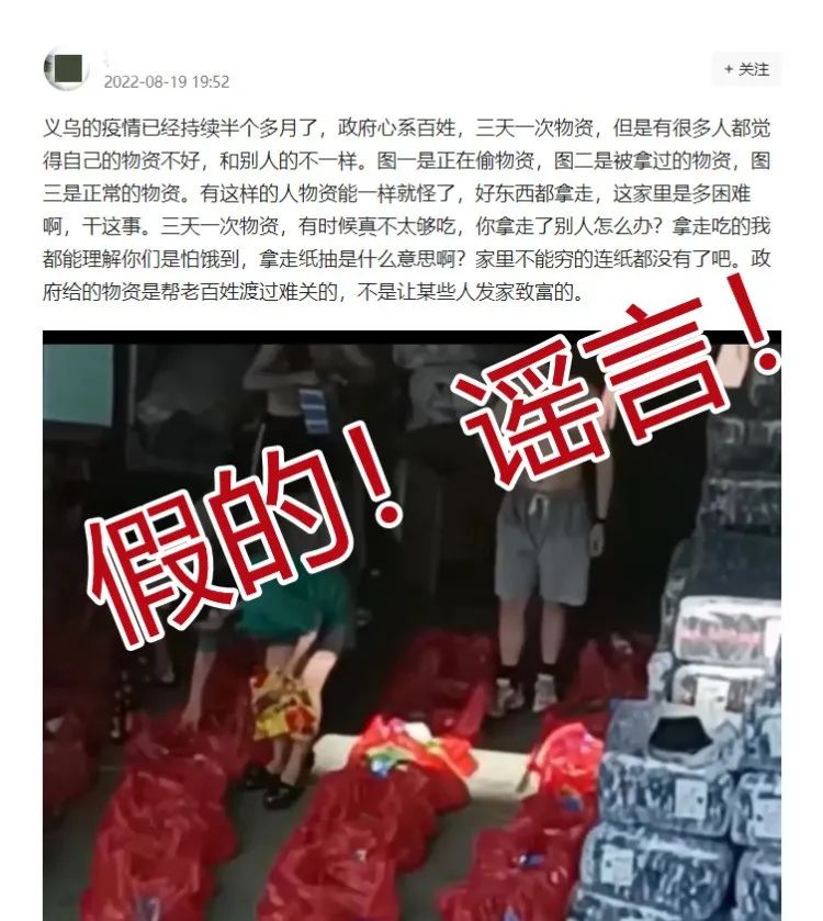 偷拿物资?有阳性病例?这些都是假的! 2022-08-20 15:30 这两天,有人在社交网络和自媒体平台发布“有人偷拿政府发放的物资”“佛堂镇白马村有阳性病例”“后宅街道北站三区有阳性病例”等消息。经多方证实,这些为不实信息。 谣言一:“有人偷拿政府发放的物资”