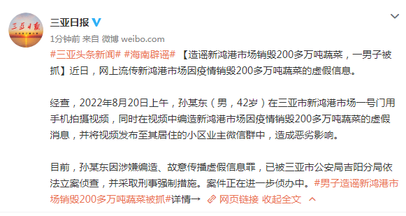 目前,孙某东因涉嫌编造、故意传播虚假信息罪,已被三亚市公安局吉阳分局依法立案侦查,并采取刑事强制措施。案件正在进一步侦办中。