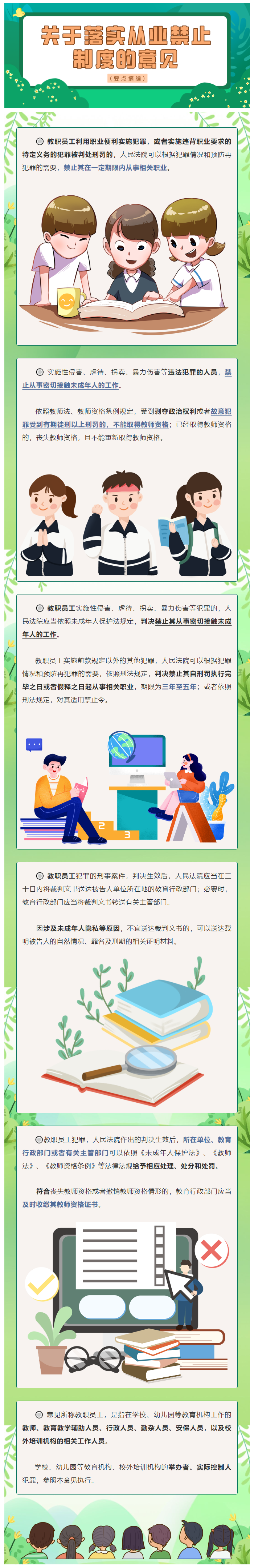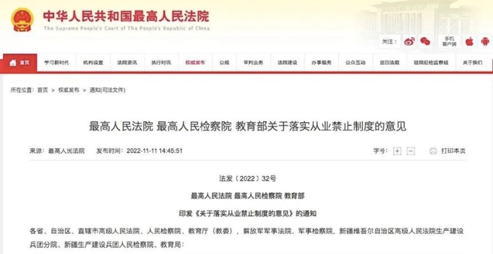 近日,最高人民法院会同最高人民检察院、教育部发布《关于落实从业禁止制度的意见》(以下简称《意见》),严格执行犯罪人员从业禁止制度,净化校园环境,切实保护未成年人。