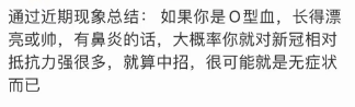 是O型血或有鼻炎就不易得新冠?专家:病毒无眼此话亦无依据 2022-12-16 10:33 “如果你是O型血,有鼻炎……大概率你就对新冠相对抵抗力强很多,就算中招,很可能就是无症状而已。”12月15日,有不少网友称,这是通过自己的观察得出了这样的结论。而这一结论,也引发了热传热议。对此,扬州大学医学院抗病毒药物研究专家张评浒告诉天目新闻记者,这些说法都没有科学依据。 天目新闻记者了解到,目前,学界通常认为,新冠病毒感染群体是非常广泛的,那是否有特别易感的人群?张评浒表示,应该不会有,新冠病毒主要通过ACE2受体介导入侵宿主,除非有个别因素导致ACE2表达才有可能,“新冠病毒没有长眼睛,无法识别这些人。”