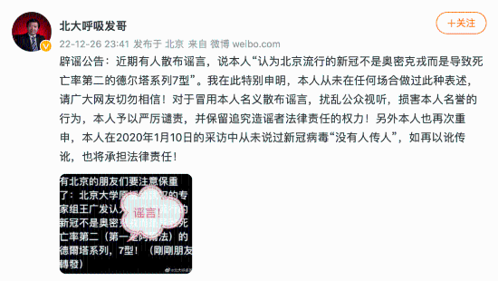 近日,一则关于北京疫情的谣言在网络上传播。12月26日深夜,北京大学第一医院呼吸内科主任王广发在个人认证的微博“北大呼吸发哥”发布辟谣公告:我在此特别申明,本人从未在任何场合做过此种表述,请广大网友切勿相信!