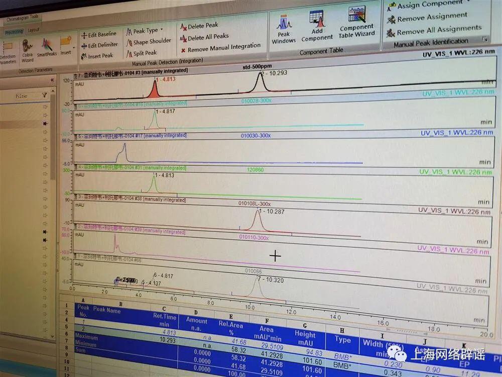 △检测人员出示了多份样品的检测结果。图上最上端为正品的成分图谱,两个“峰”分别为“奈玛特韦”和“利托那韦”,往下数第三条为“奥司他韦”的成分图谱。