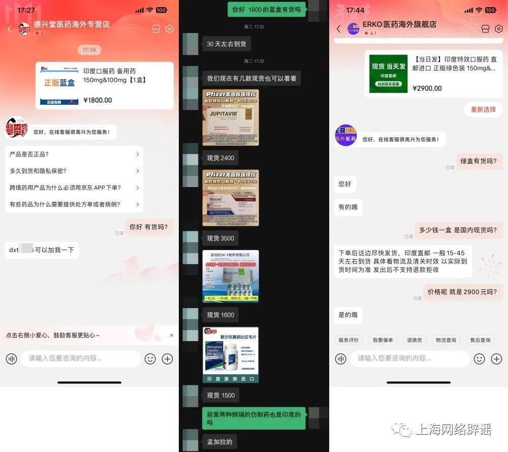 有货吗?1800元销售“正版蓝盒”的商家“德兴堂”告诉记者没有现货,需要等待30天到货。但加了商家微信后,对方推荐了孟加拉国产的另外两款Paxlovid仿制药,售价2400元和3500元一盒,均有“国内现货”;另一商家“ERKO医药海外旗舰店”正在销售2900元的“正版绿盒”,客服称有现货,印度直邮15-45天送达……