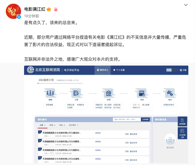 28日,在连续发文回应网传指控后,电影《满江红》官方微博又晒出电子诉讼平台截图,表示“近期,部分用户通过网络平台捏造有关电影《满江红》的不实信息并大量传播,严重危害了影片的合法权益,现正式对以下造谣者提起诉讼。”