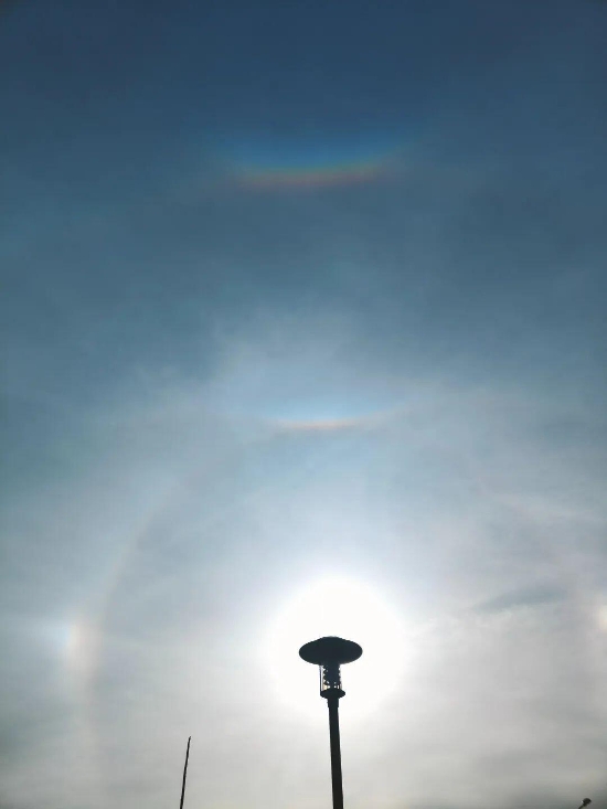 摄影:霍东晴 细看大的圆环“晕”之外,还有一道“七彩弧线”。这是环天顶弧,也是日光照射到云层中的冰晶产生的折射或反射所致。 由于空中的高云是由冰晶组成的,冰晶可以对太阳光进行散射和折射,当太阳的角度合适的时候,冰晶的散射和折射便形成了晕族中各种不同的现象,这就和我们常见的三棱镜折射原理一样。晕族的出现是一种大气光学的常见自然现象。 “晕”经常是坏天气出现前的征兆,中国古代就有“月晕而风”的记载,预示着大风即将来临。因为“晕”常出现在由冰晶组成的卷层云中,这种云是风暴来临的前驱云类之一。