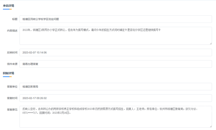 “去年这2所民办学校转公,今年划分学区还是继续摇号?”钱塘区教育局公开回应 2023-02-22 10:23 去年一批民办学校转公,今年招生采取什么方式,是很多家长特别关心的问题。 日前有家长在浙江省民呼我为统一平台上提问:“2022年,钱塘区2所民办小学正式转公,但去年为摇号模式。请问今年的招生方式何时确定?是否划分学区还是继续摇号?” 钱塘区教育局做了如下回复:“反映人您好,去年转公办的两所学校养正学校和启成学校2023年仍然按照原方式摇号招生。回复人:王老师;所在单位:杭州市钱塘区教育局;回复电话:0571****717。回复时间:2023年2月16日。”