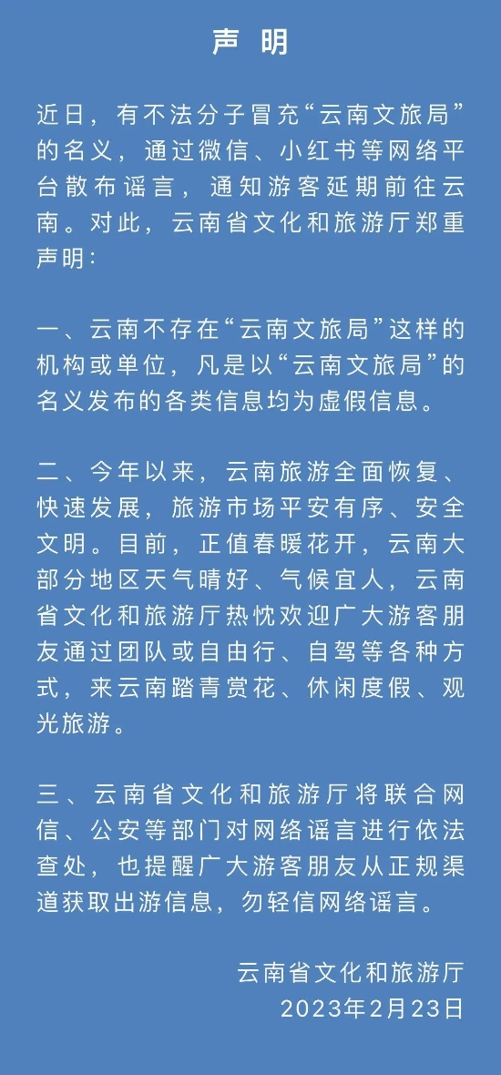 近日,有不法分子冒充“云南文旅局”的名义,通过微信、小红书等网络平台散布谣言,通知游客延期前往云南。对此,云南省文化和旅游厅表示,不存在“云南文旅局”这样的机构或单位,凡是以此名义发布的各类信息均为虚假信息。当前,春光正好,欢迎广大游客来云南观光旅游。