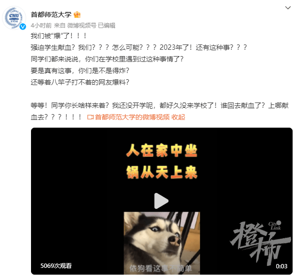 首都师范大学在官微上回应“强制学生献血”流言:“我们被‘爆’了,强迫学生献血?怎么可能?同学们都来说说,你们在学校里遇到过这种事情了……我还没开学呢,都好久没来学校了!谁回去献血了?上哪献血去?”