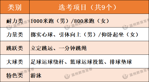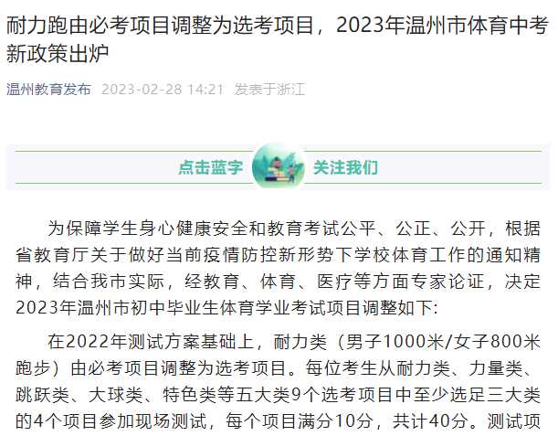 昨天,温州市教育局发布了2023年温州体育中考新政策,明确初中毕业生体育学业考试项目将调整,耐力跑由必考项目调整为选考项目。