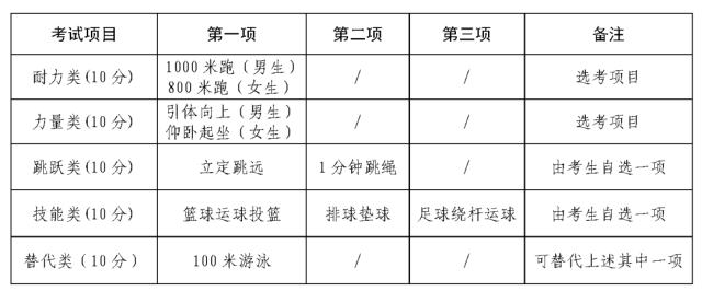 技能类为篮球运球投篮、排球垫球、足球绕杆运球,由考生自选其中一项;替代类为100米游泳,可替代耐力类、力量类、跳跃类、技能类中的其中一项(具体见下表)。
