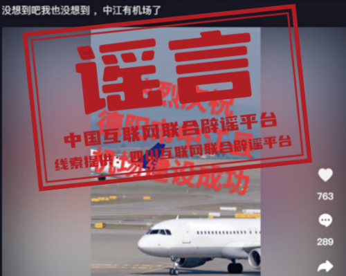 真相:近期,多名网民在抖音短视频平台发布“四川德阳中江机场建设成功”“德阳中江仓山镇要修机场”“中江国际机场直飞拉萨”等信息,引发关注。经四川省规划部门核实,该信息不实。(来源:四川互联网联合辟谣平台、@微播中江)